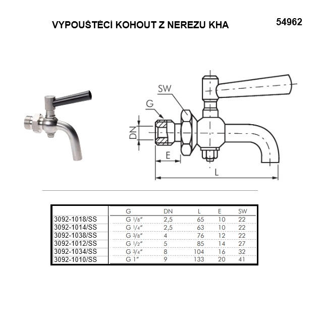 3092-1010-V/AG-SS; Celková délka (mm) L=133, Provozní tlak (bar) 6, Vnější závit G 1", DN (mm) 9, Hmotnost (kg) 1, Šestihran 41