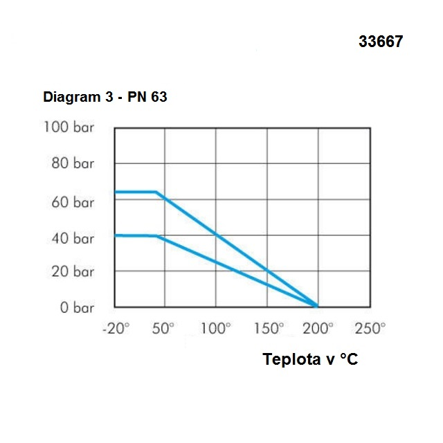 PN 63 - Dle diagramu lze odvodit, že kohout je 20 barový pro teplotu 120°C. Médium: Voda, pára, olej, stlačený vzduch, pohonné hmoty, rozpouštědla, agresivní média.