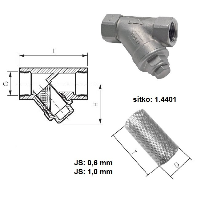 Velikost sítka: kóty *T - délka sítka, *D= průměr sítka, velikost ok a "JS" je v kódu a parametrizován. Náhradní díly (sítka) jsou vhodná pouze dle PN, jsou ve 4 velikostech, proto pozorně zkontrolujte údaje v kódu .."TD" (tj průměr a délku). Příklad kodu 1"/ MS: SF10/0.5-TD47/30MS ...T= 47 mm, D=30 mm, ø ok síta 0,5 mm. Jiné oka: ø0,2 mm (v kódu 0.2), ø0,6 mm (v kódu 0.6), apod.