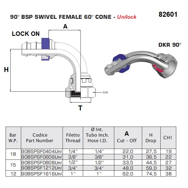 VariantyF90G0404LOCK-SS; Provozní tlak (bar) 18, Vnitřní závit G 1/4", Hmotnost (kg) 0,165, Šestihran 19, Kóta A 22, Výška H=27,5, Hadice d/D 1/4"