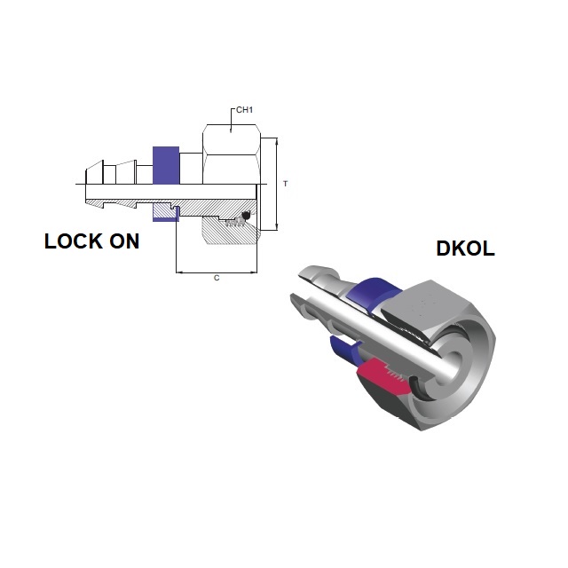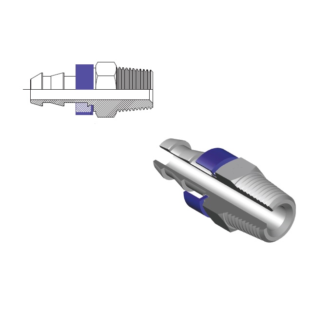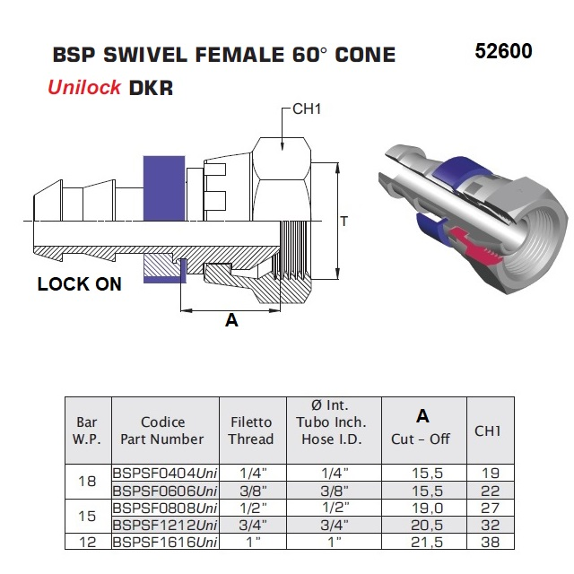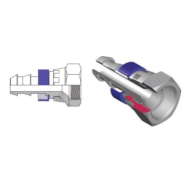 VariantyFDG0404LOCK-SS; Provozní tlak (bar) 18, Vnitřní závit G 1/4", DN (mm) 6, Hmotnost (kg) 0,122, Šestihran 19, Kóta A 15,5, Hadice d/D 1/4"