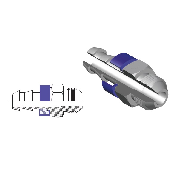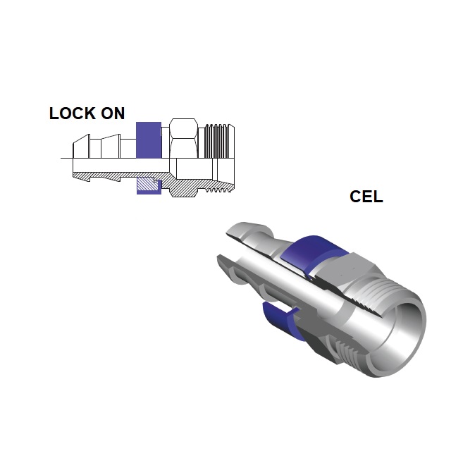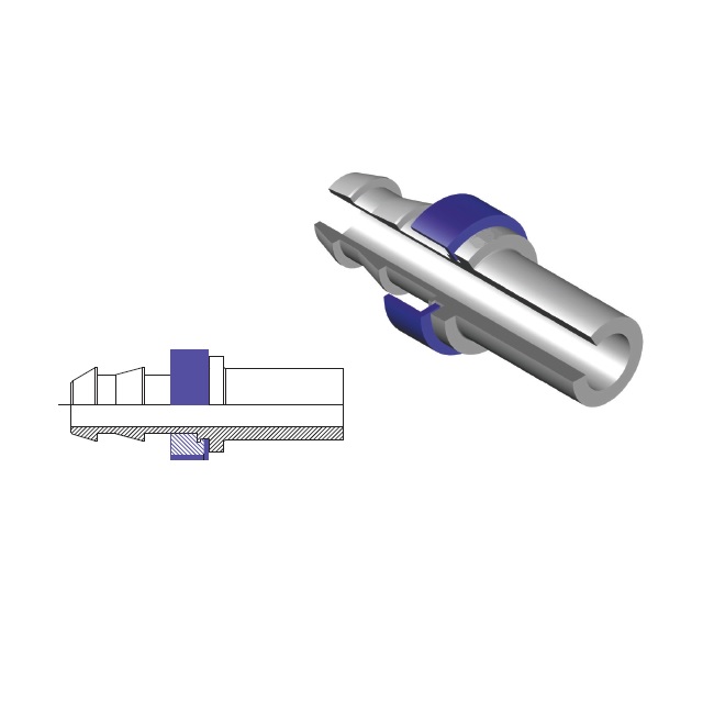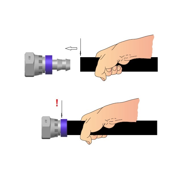 Správný postup: Seřízněte hadici kolmo, konec zasuňte přes bajonety až na konec trnu pod modré plastové objímky. Jedině tak je zabezpečeno, že hadice je pro uvedený provozní tlak zaarmovaná správně.