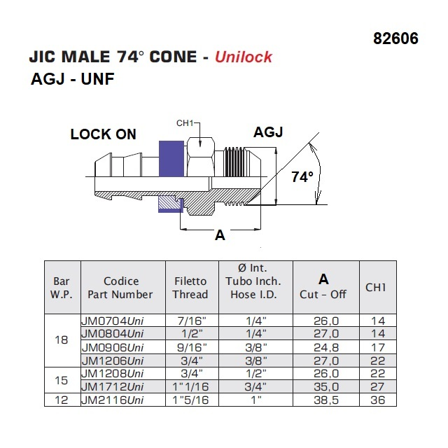 VariantyAGJ0407LOCK-SS; Provozní tlak (bar) 18, Vnější závit JIC 7/16", Hmotnost (kg) 0,105, Šestihran 14, Hadice d/D 1/4"