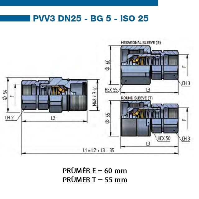 VDM1012/55; Provozní tlak (bar) 300, Vnitřní závit G 3/4", DN (mm) 25, Rozměr nebo typ závitu M48x3, Hmotnost (kg) 0,641, Velikost [modul] BG 5