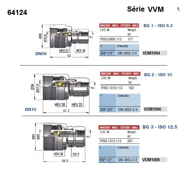 VDM1008; Provozní tlak (bar) 400, Vnitřní závit G 1/2", DN (mm) 13, Rozměr nebo typ závitu M36x2, Hmotnost (kg) 0,27, Velikost [modul] BG 3