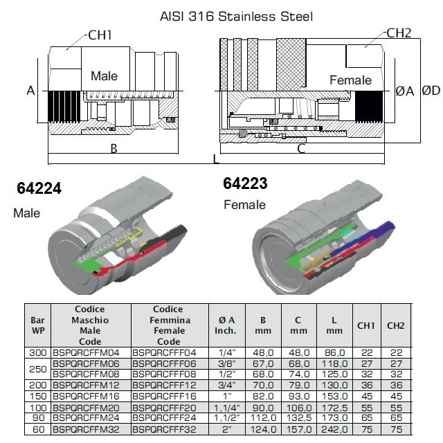 Hydraulická nerezová bezodkapová rychlospojka s palcovými závity, 200-500 bar (PLT4)