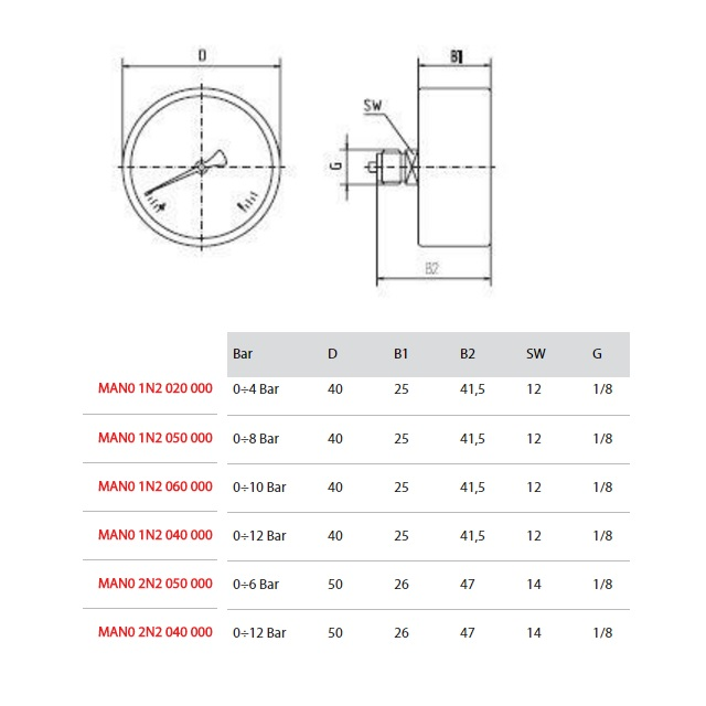 MAN01N2040000; Provozní tlak (bar) 0-12, Vnější závit G 1/8", DN (mm) 40, Hmotnost (kg) 0,052, Šestihran 12, Provedení zadní připojení