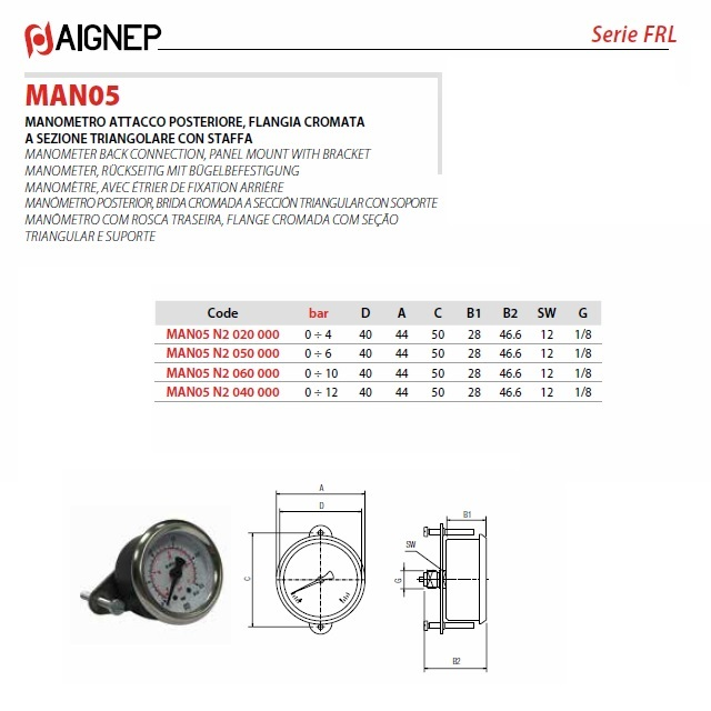 MAN05N2020000; Provozní tlak (bar) 0-4, Vnější závit G 1/8", DN (mm) 40, Hmotnost (kg) 0,095, Šestihran 12, Provedení panelový