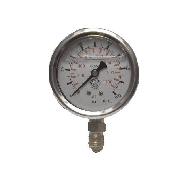 Glycerinový manometr pro hydrauliku, D=40 mm, spodní nebo zadní připojení. Základní třída přesnost tohoto typu je 1,6%.Glycerinová náplň usnadňuje odečtení měřeného tlaku. Pro měření tlaku vzduchu, vody, oleje a neagresivních látek. Otřesuvzdorné manometry s vodotěsným pouzdrem jsou určeny do těžších podmínek, kdy na manometr působí vibrace, vlhkost a jiné ztěžující podmínky.