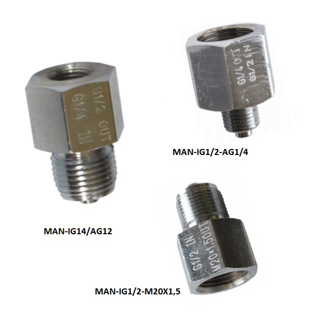 MAN-IG14/AG12-SS; Provozní tlak (bar) -1/450, Vnitřní závit G 1/4", Vnější závit G 1/2", Hmotnost (kg) 0,125, Šestihran 27, Materiál Nerez