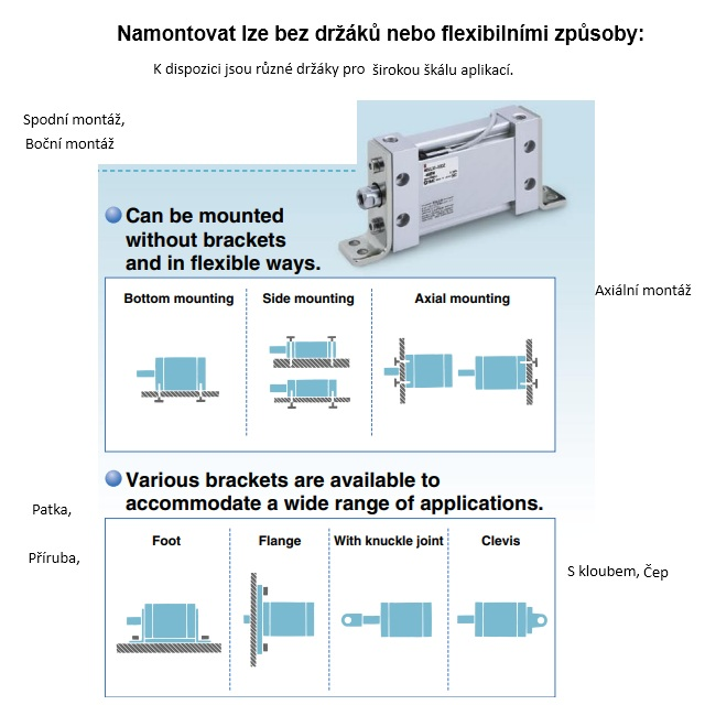 MU /MDU, Kompaktní válce dvojčinné, jednostranná pístnice., oválný píst.Průměry pístu: 25, 32, 40, 50 a 63 mm.Zdvihy: max. 300 mm. Maximální vstupní tlak 7 bar.Výbava a montáže: B- základní provedení, L-patka, F= příruba vpředu, G=příruba vzadu, C=závěsné oko, D=závěsná vidlice.Typy připojovacího závitu: U ø25 mm = metrický vnitřní závit M6x1, ø32, 40, 50 a 63 mm = M8x1,25, (možnost i NPT).Drážky pro snímače polohy brání jejích vyčnívání. Možnost montáže snímačů polohy ze 4 stran.