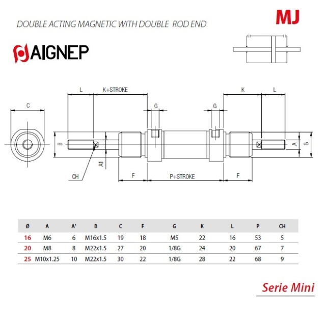 Dvojčinný magnetický mini válec, série Mini, Pneumatický válec dle ISO 6432. Dvojčinné válce pracují na principů dvou tlakových přívodů (vtoků), které převedou tlakovou energii na axiální výsun pístnice, čímž konají práci, nepotřebují zpětnou pružinu na výchozí polohu.Hlavní charakteristikou těchto válců je pevnost a spolehlivost díky výrobní struktuře. Splňují maximální požadavky na výkon a zatížení při posunech, mají magnetické tlumení na konci zdvihů.Tlumení se jednoduše seřizuje dvěma zapuštěnými šroubky na každém konci samostatně.