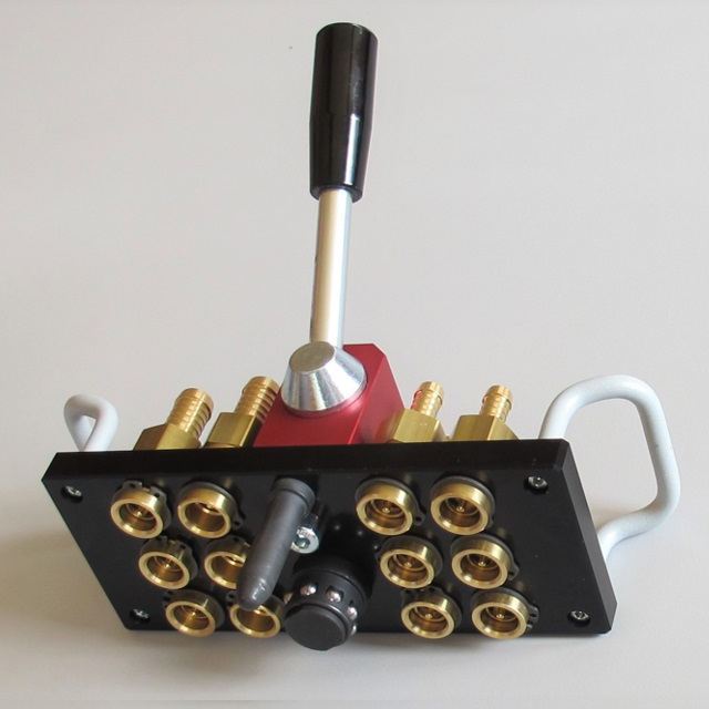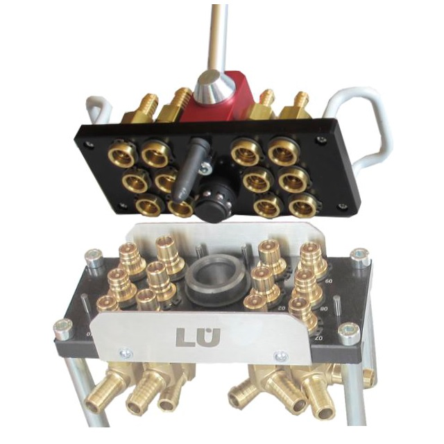 Pro aplikace s regulací teploty s horkou nebo studenou vodou a také temperovaným olejem.Multi-spojkový systém umožňuje připojit několik okruhy regulace teploty v jednom kroku.Jedná se o MKMH je profil HASCO (evropský) a DME (mezinárodní). Dn9 -řada ESH Lüdecke uvádí okraj rozměr čepu 13mm, přes výtupky čepu naměříte 13,4 mm.Teplota v závislosti na médium: (olej: +200°C, voda: +150°C, vzduch: +200°C).Desky, pouzdro páky: eloxovaný hliník, Páka včetně montáže, Hřídel: Pozinkovaná ocel, hlava: termoset (PF), rukojeť: Potažena hliníkemDíky modulární konstrukci lze sestavit každou multispojku a konfigurován individuálně, a proto je dokonale přizpůsoben jakémukoli požadavku a aplikace.Výhody:Rychlé a současné připojení několika teplot regulační linky. Pomocí páky snadno a rychle připojíte a odpojíte systémy. Zvýšená bezpečnost a účinnost: žádné riziko záměny spojů/hadic, zkrácená doba vybavování.Snadná obsluha, robustní, vysoce kvalitní, odolný proti úniku.Můžete vybrat mezi verzí se 6, 12 nebo 20 připojeními.Talíře lze objednat také v červené nebo modré barvě.Páka se standardně zavírá ve směru hodinových ručiček, ale na přání je k dispozici i zavírání proti směru hodinových ručiček, kování se objednává zvlášť.