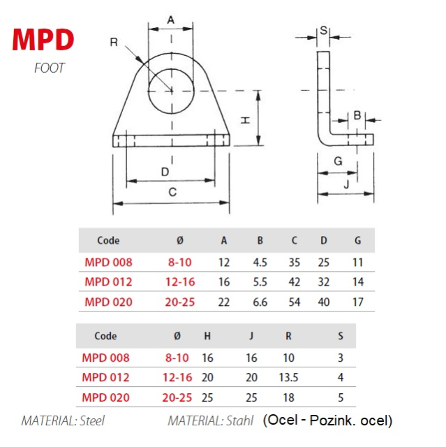 MPD008; Série Mini, Tloušťka (mm) 3, Vstup (otvor) (mm) 12 mm, Průměr otvoru pro šrouby 4,5, Hmotnost (kg) 0,023