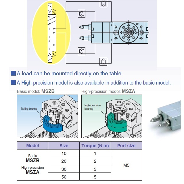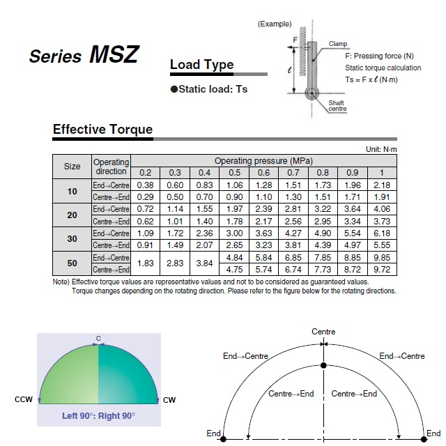 MSZ, Otočný stůl, 3-polohový.Celkový úhel kyvu: 0 až 190°, střední poloha ± 10° od osy pastorku, krajní polohy 0 - 95° od osy pastorku.Rozsah nastavení doby kyvu: 0.2 až 1 s (/ 90°).
