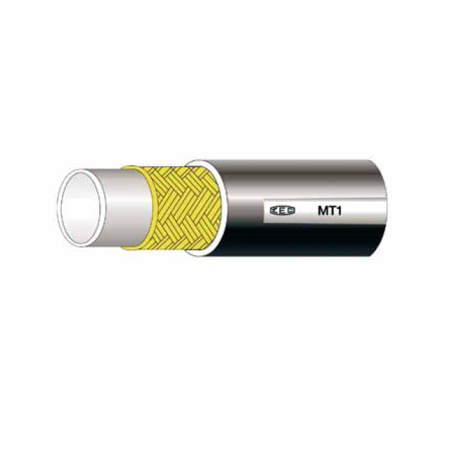 Termoplastická hydraulická hadice single SAE 100 R1, vhodná především pro barvy, ředidla, rozpouštědla a plyny. Vnitřní jádro z polyamidu, výztuž z ocelových pletenin s vysokou pevností v tahu a vnější obložení v antiabrasivním polyuretanu, mikroporézní na vyžádání pro vedení vzduchu a kompatibilních plynů.Hadice řady MT1 byly vytvořeny pro vysokotlaké vedení polyolů, rozpouštědel, barev a kompatibilních plynů.Hadice splňují nebo překračují tlaky podle SAE 100R1 - EN 853 1., 1SN - EN 857 1SC Standardy.