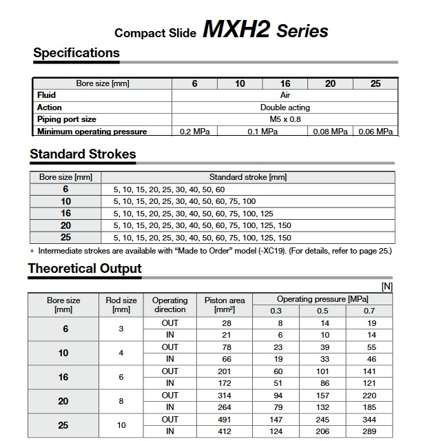 MXH-Z, Kompaktní přesný suport, valivé vedení.Průměry pístu: 6, 10, 16, 20 a 25 mm. Max. rychlost pístu 500 mm/s.Zvláštní poloha připojovacích závitů, elastomerové dorazy.Volitelné: snímače polohy: M9B, M9BA, M9BV, M9BW, NPN snímače: M9N, M9NA, M9NV, M9BW, jazýčkové- A90, A90V, A93, A96 apod.Teoretická síla při 5 barech např. ø pístu 10: Tlak = 39N, tah = 33N.Vše viz originální katalog.