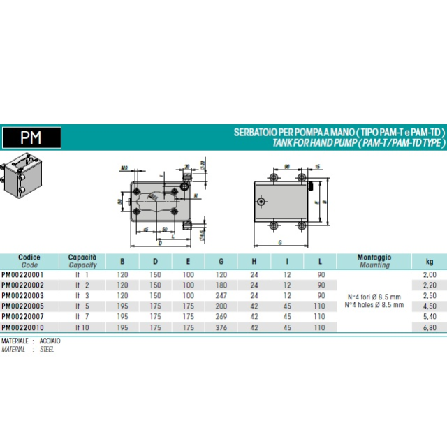 Nádrž řady PM pro ruční čerpadlo řady PAM-T nebo PAM-TD. Vyrobena z oceli, což z ní činí pevné a ekonomické řešení pro uchování potřebné zásoby oleje k napájení ručního čerpadla.Lakována černou barvou.Objem nádrže: 1 až 10l.