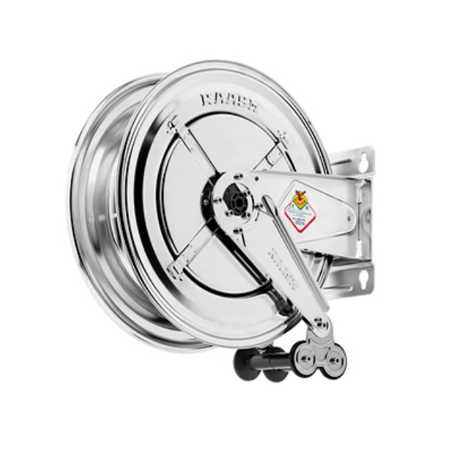 Nerezový naviják bez hadice pro horkou vodu, do do 400 bar. Naviják bez hadice na základě požadavku osadíme hadicí s koncovkami.V případě že bude osazen s hadicí, má automatickou stopku, která každých 60 cm zabraňuje samovolnému návratu hadice zpět. Hadice se pak může protáčet v rychlospojce a nepřekrucuje se.Naviják je též vhodný i do prostředí ATEX (zóna 1 a 21).8434.350-400B-SSG3/8 - Pevný naviják z nerezové oceli AISI 304, série S.430, pro horkou vodu, do 400 bar, bez hadice. Vstup G 3/8" (f), výstup G 1/2" (f).
