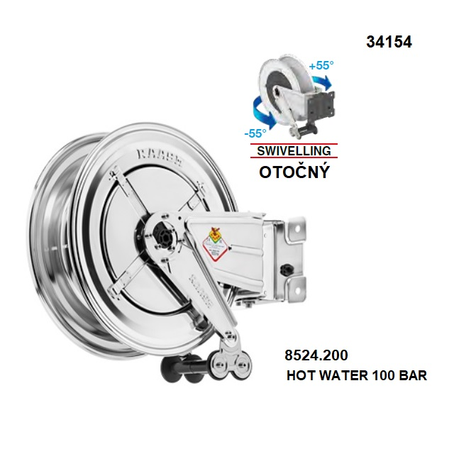 V případě osazení hadicí je naviják vybaven automatickou stopkou, která po návratu hadice zpět zastaví každých 60 cm. Naviják bez hadice na základě požadavku osadíme hadicí s koncovkami.Hadice se může protáčet v rychlospojce a nepřekrucuje se! Otočný naviják kopíruje směr natočení k tažení hadice až o 55° na obě strany.Naviják je též vhodný i do prostředí ATEX (zóna 1 a 21).Kapacita bubnu: Série 520....1/2" hadice - 25 m, 3/8" - 30 m. Jiné průměry s délky nutné konzultovat.8524.200-100B-SSG1/2 - Otočný naviják na hadici z nerezové oceli AISI 304, série S.530, pro horkou vodu do 100 bar, bez hadice. Vstup a výstup G 1/2"(f).8524.300-200B-SSG1/2 - Otočný naviják na hadici z nerezové oceli AISI 304, série S.530, pro horkou vodu do 200 bar, bez hadice. Vstup G 3/8"(f), výstup G 1/2"(f).8524.350-400B-SSG1/2 - Otočný naviják na hadici z nerezové oceli AISI 304, série S.530, pro horkou vodu do 400 bar, bez hadice. Vstup G 3/8"(f), výstup G 1/2"(f), těsnění Teflon.