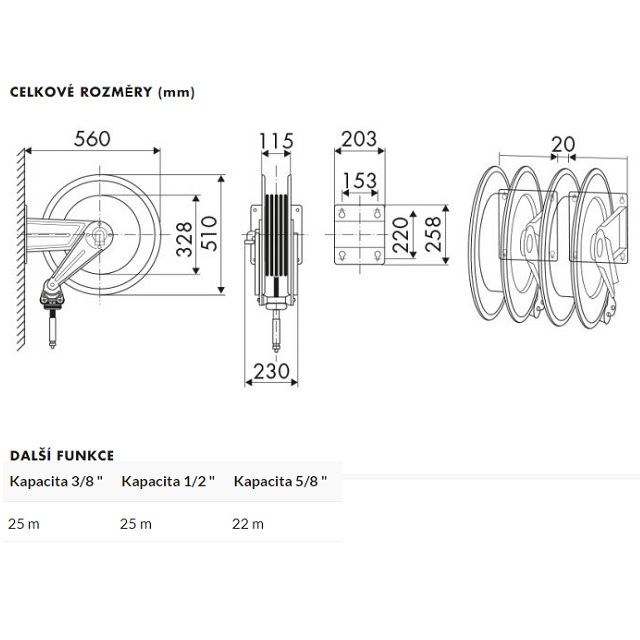 Naviják určený pro doplňování provozních kapalin v automobilním průmyslu, zemědělství apod.Je vybaven automatickou stopkou, která každých 60 cm zabraňuje samovolnému návratu hadice zpět.Hadice se může protáčet v rychlospojce a nepřekrucuje se.Naviják je též vhodný i do prostředí ATEX (zóna 1 a 21).Naviják bez hadice na základě požadavku osadíme hadicí s koncovkami.530.40-150B-FEG-1/2 - Pevný naviják bez hadice, série S.530, pro oleje a podobné, do 150 bar, bez hadice. Vstup a výstup G 1/2"(f). Kapacita bubnu 1/2" hadice - 25 m.530.40-150B-FEG-1/2+SM - Pevný naviják bez hadice série S.530, pro olej a podobné, do 150 bar, bez hadice. Vstup a výstup G 1/2"(f). S pevným držákem. Kapacita bubnu 1/2" hadice - 25 m.530.41-150B-FEG-1/2 - Pevný naviják s hadicí, série S.530, pro olej a podobné, do 150 bar, s černou gumovou hadicí 20 m, ø 1/2".530.42-150B-FEG-1/2 - Pevný naviják s hadicí, Série S.530, pro olej a podobné, do 150 bar, s černou gumovou hadicí 25 m, ø 1/2".