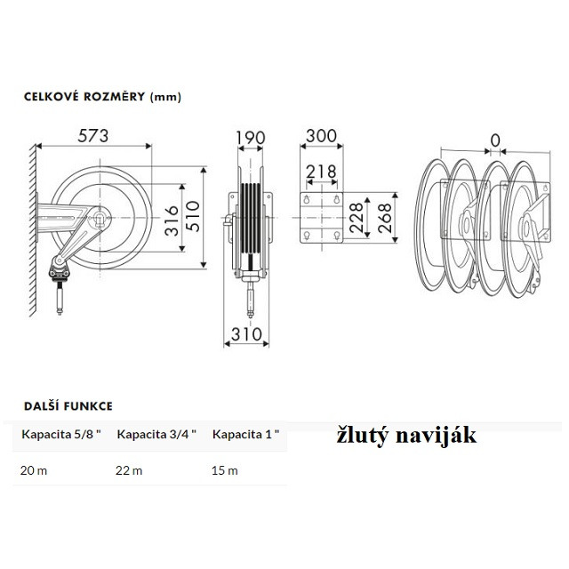 Naviják je též vhodný do ATEX prostředí (zóna 1 a 21).Naviják bez hadice na základě požadavku osadíme hadicí s koncovkami.Naviják který má v kódu +SM má konzolu (samostně balenou) již v ceně.8540.200-100B-FE-G1 - Pevný šedý naviják bez hadice, série S.540, pro horkou vodu, do 100 bar, bez hadice. Vstup a výstup G 1"(f).540.20-100B-FE-G1 - Pevný žlutý naviják bez hadice, Série S.540, pro horkou vodu, 100 bar, bez hadice. Vstup a výstup G 1"(f).540.20-100B-FE-G1+SM - Pevný žlutý naviják bez hadice, série S.540, pro horkou vodu, 100 bar, bez hadice. Vstup a výstup G 1"(f). S pevným držákem.KG196-540/20 - OTOČNÉ L PŘIPOJENÍ NAVIJÁKU S. 540/20 - středové koleno G 1" - Náhradní díl.