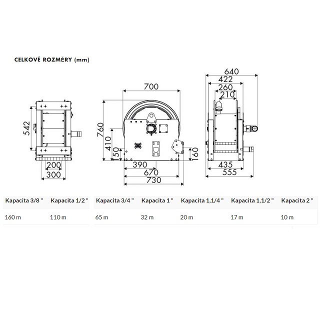 721801/10-20B-G2-G2 - Označení výrobce P/N 7721801.100.Hadicový naviják s hydraulickou motorizací z lakované oceli série S.700, pro vzduch-voda a naftu, 20 bar, bez hadice.Hydromotor musí být připojen ke speciální řídicí jednotce vybavený čerpadlem s elektrickým motorem, nádrž hydraulického oleje a řídicí systém provozovaný uživatelem.Odvíjení hadice probíhá ručně, zatímco přivíjení se provádí pomocí hydraulického motoru připojeného k a speciální řídicí jednotka.Naviják bez hadice na základě požadavku osadíme hadicí s koncovkami.Šíře bubnu 270 mm. Vstup a výstup IG 2"(female).