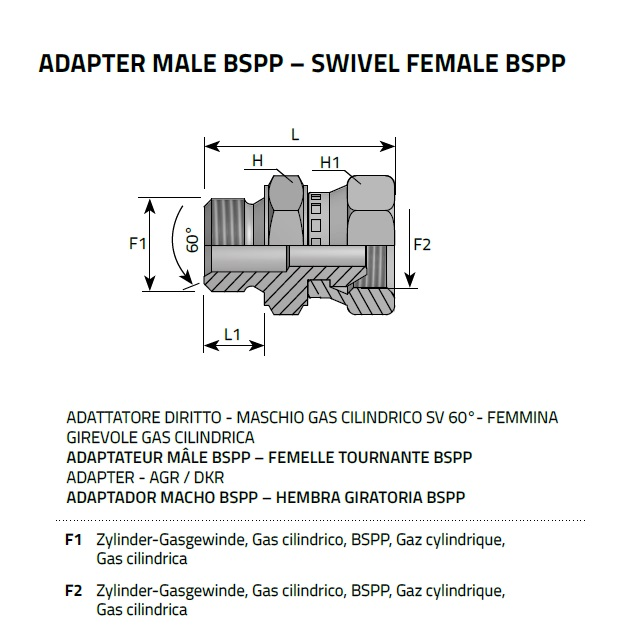 AMFDG0606; Celková délka (mm) L2=41,5, Provozní tlak (bar) 280, Vnitřní závit G 3/8", Vnější závit G 3/8", Délka závitu (mm) L1=12,5, Hmotnost (kg) 0,03, Šestihran 22/22