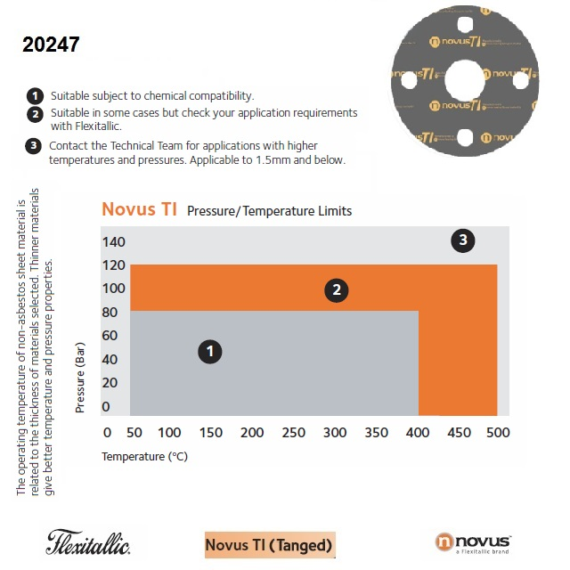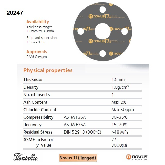 Novus TI je flexibilní grafito laminátový materiál zesílený nerezovou vložkou (316) o tloušťce 0,1 mm. Grafitová vrstva je vložena pomocí super tenké vrstvy lepidla bez chloridů.Vložka v robustním těsnícím materiálu má vynikající mechanickou pevnost a při řezání těsnění je plně kompaktní.Použití: Široká škála aplikací v chemickém, petrochemickém nebo ve všeobecném průmyslu zejména pro kompresorové přírubové těsnění. Potrubní a lodní systémy. Výhody a přednosti těsnění: široký rozsah provozních teplot při zachování flexitility, vynikající zachování napětí přírubového spoje např. u páry, stálost a těsnost těsnění ve spoji.