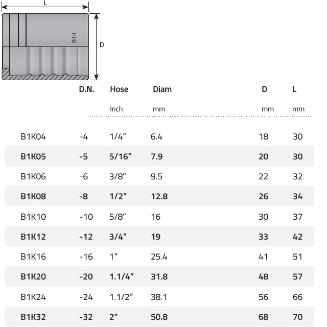 B1K08; Celková délka (mm) 34, Průměr (mm) D=26, DN (mm) 12, Hmotnost (kg) 0,02, Velikost [modul] (-08), Určeno na hadici [mm] 12,1, Hadice d/D 1/2"