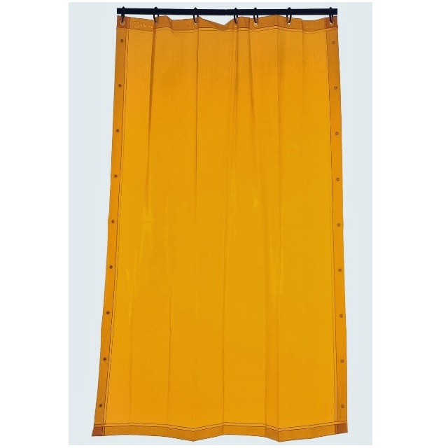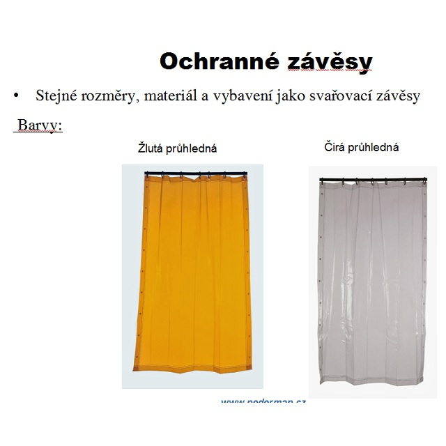 Ochranné závěsy pro stínění svařovacích míst dle normy ČSN / EN 1598.Chrání před stříkající vodou a prachem v průmyslových aplikacích (broušení, leštění, ofukování).Samozhášející materiál PVC tloušťky 0,4 mm (čirý má tloušťku 0,5mm), teplota vznícení 320-390°C, teplotní odolnost +5°C / +80°C, dodávka vč. 7ks závěsných kroužků, vyztužených otvorů a spínacích patentek. Na nařasení počítat cca 10% šířky.Standardní rozměry jako u svařovacích závěsů - šířka 1400 mm, standardní barvy: žlutá transparentní a čirá transparentní.