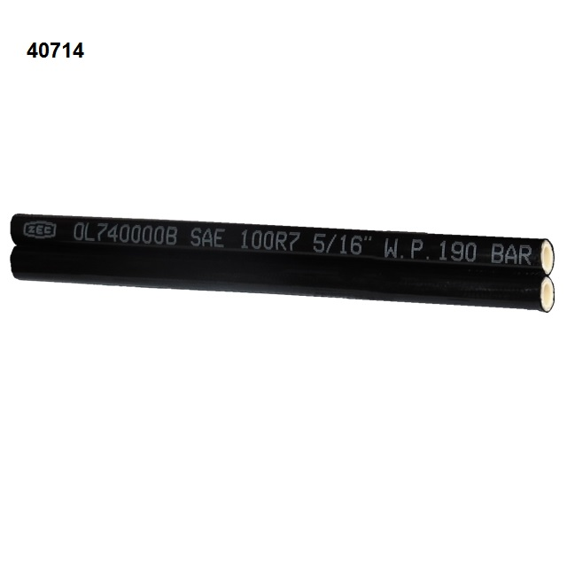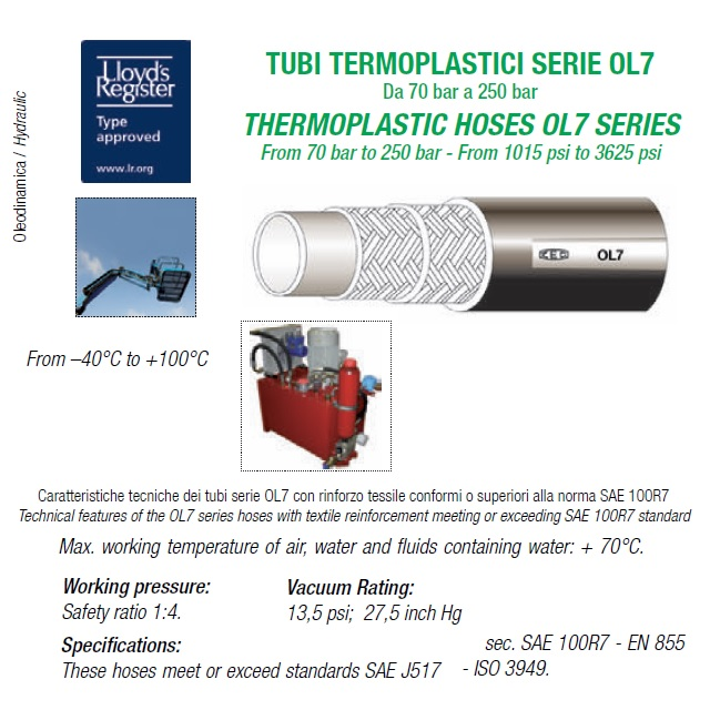 Termoplastická hydraulická twin hadice SAE 100 R7 (dvojče), určené pro rozlišení větví u strojů a usnadnění montáže.Vnitřní jádro z termoplastického polyesteru, polyesterová textilní výztuž a vnější obložení v antiabrasivním polyuretanu stabilizované proti UV záření a mikroorganismům odolné.Použití: doprava olejů, kapalin, na poptávku i verze pro plyny.Max. provozní teplota vzduchu, vody a tekutin na bázi vody je +70°C, 0,93 bar; 700 mm HgOL7 - Termoplastická single hadice SAE 100R7. Odolné vůči UV záření a odolné vůči mikroorganismům. Hadice splňují nebo překračují SAE J517 sekt. SAE 100R7 - a normy ISO 3949.