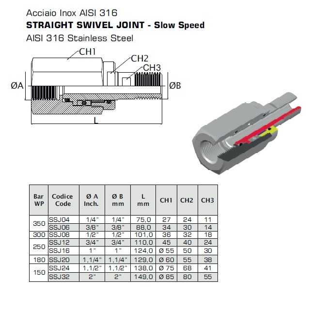Otočné spoje řady SSJ jsou navrženy pro montáž mezi tlakovou hadicí a stacionární část stroje za účelem umožnění rotačního pohybu. Použití: Vhodné pro navijáky nebo návěsy, není vhodné pro stálé rotace. Uvedené tlaky v tabulce jsou pro natáčející se spojky a statickou polohu. Na poptávku dodáváme provedení s NPT závity.