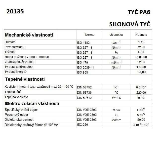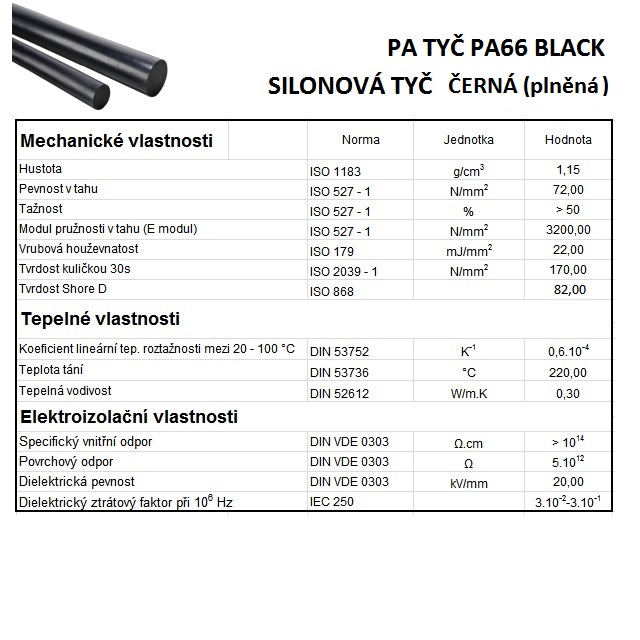 Materiál PA6 - (dříve známé pod názvem silonové tyče) je vhodný pro obrábění na soustruhu nebo frézkách díky snadné obrobitelnosti.Izolační vlastnosti - dielektrikum DIN VDE 0303: R>10*14 Ω.cm.Z tohoto polyamidu se nejčastěji vyrábějí dorazy, pouzdra, tlumící prvky nebo se jim nahrazují dřevěné prvky. Tyč se prodává po ks, 1 ks = 1 m.Černý materiál je polyamid PA66 je vyztužený 30-ti procenty skleněných vláken pro zvýšenou pevnost, tuhost, odolnost proti tečení a rozměrovou stálost. Je v tvrdosti o 3° Shore D měkčí než PA6.