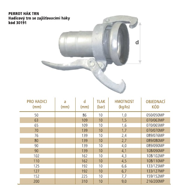 Varianty050/050MP; Provozní tlak (bar) 10, DN (mm) 50, Hmotnost (kg) 0,9571, Určeno na hadici [mm] 50, Výška