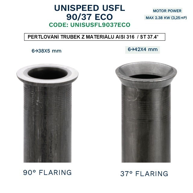 Stroj pro rozšíření konce hydraulických trubek v úhlech 37° a 90°.Pertlování trubky s vnějším průměrem od 6 mm do 42 mm a tloušťkou stěny až 4 mm do úhlu 37°.Pertlování trubky s vnějším průměrem od 6 mm do 38 mm a tloušťkou stěny až 5 mm do úhlu 90°.Různé možnosti nastavení a konfigurace USFL9037ECO umožňují dosáhnout libovolného průměru a tloušťky rozšířeného konce trubky.ROZMĚRY DxŠxV: 760x830x1210 mm.VÝKON MOTORU: 2,38 kW.Olej do stroje je nutné doplnit 3 litrů viskozity jako HM46, dle norem DIN 51524-část 2 (HLP), ISO 11158 (HM).Dodáváno dle předpisů UNI ISO 8434-2 a DIN 3949. Použití nerezové oceli jiné než AISI 316 TI může negativně ovlivnit kvalitu pertlování i životnost nástrojů.Doda dodání od dodavatele 1-2 týdny. Cena dopravy na paletě 3000kč.