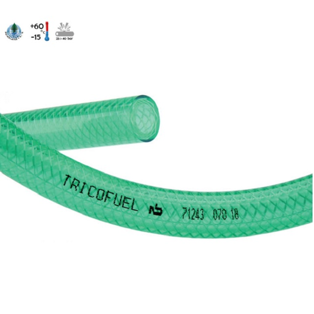 Plastová hadice na výtlak benzínů, nafty, oleje, lihu, pro ochranu před mrazem, čerpadla, oběhová čerpadla, hořáky,topné zařízení, určité kyseliny a některé zásy. Není vhodná pro aromatické uhlovodíky.Aplikace: je speciálně navrženo pro přenos uhlovodíků.Všechna palivová potrubíPro čerpadla, oběhová čerpadla, hořáky, ohřívače vinné révyPro ochranu proti mrazu, topná zařízení…Přeprava některých chemických produktů: benziny, některé kyseliny a některé zásady, oleje, alkoholy… (není vhodné pro aromatické uhlovodíky)Průhledný vzhled umožňuje snadnou vizuální kontrolu přenosu kapalin.Uvedené parametry v tabulce platí při teplotě 20°C.