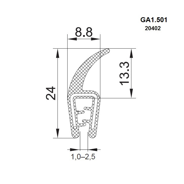VariantyGA1.501.EPDM60-1; Série A1 501, D.* (mm) 13.3, Hmotnost (kg) 0,146, Velikost [modul] 1 - 2,5 mm, Kóta B 24, Kóta A 8,8, Typ 60°Sh EPDM
