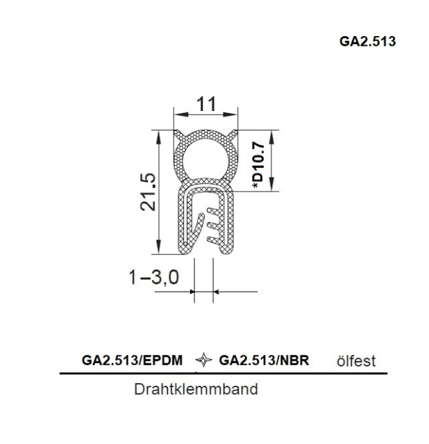 VariantyGA2.513.EPDM60-1; Série A2 513, D.* (mm) *D1 - 3 mm, Hmotnost (kg) 0,162, Velikost [modul] *O 10,7 mm, Kóta B 21,5, Kóta A 11, Typ 60°Sh EPDM
