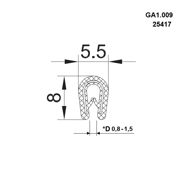 VariantyGA1.009.PVC78-1; Šířka (mm) 5,5, Série A1 009, D.* (mm) *D0,8- 1,5, Hmotnost (kg) 0,023, Kóta B 8, Barva černá