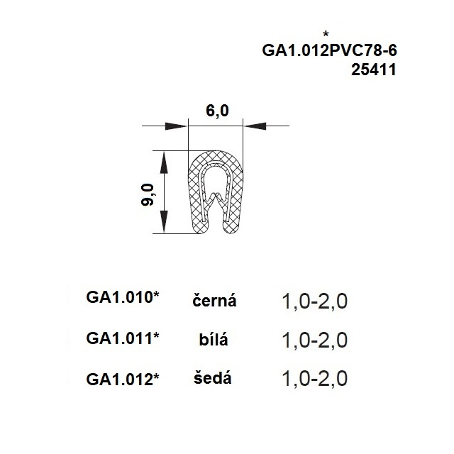 VariantyGA1.010.PVC78-1; Šířka (mm) 6, Série A1 010, D.* (mm) *D1 - 2 mm, Hmotnost (kg) 0,074, Kóta B 9, Barva černá