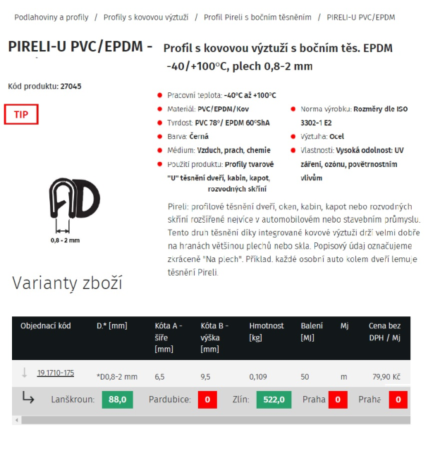 Těsnění PIRELI - pryžový profil U s bočním těsněním s ocelovou výztuhou v materilálu U-PVC, břicho EPDM.Použití: Těsnění dveří, oken, kabin, kapot nebo rozvodných skříní, vhodné pro těsnění automobilový, energetický a stavební průmysl.Těsnění díky integrované ocelové výztuži drží velmi dobře na hraně různých typů strojírenských výrobků.Vysoká odolnost: UV záření, ozónu, povětrnostním vlivům, kyselinám nízkých koncentrací, alkoholu, louhům.Mírná odolnost: Aromatické uhlovodíky, benzíny, oleje, koncentrované kyseliny.Rozměry dle ISO 3302-1 E2.