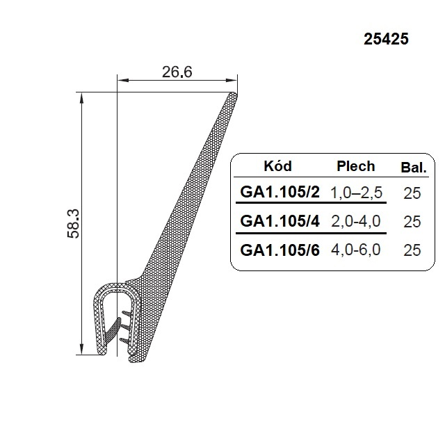 VariantyGA1.105/2.EPDM60-1; Šířka (mm) 11, Série A1 105/*, D.* (mm) *D 1-2 mm, Hmotnost (kg) 0,54, Kóta B 58,3, Kóta A 26,6