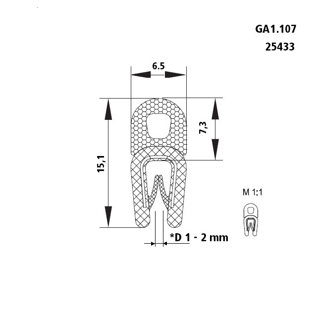 VariantyGA1.107.EPDM60-1; Šířka (mm) 6,5, Série A1 107, D.* (mm) *D 1 - 2,0 mm, Hmotnost (kg) 0,194, Velikost [modul] *O 7,3 mm, Kóta B 15,1