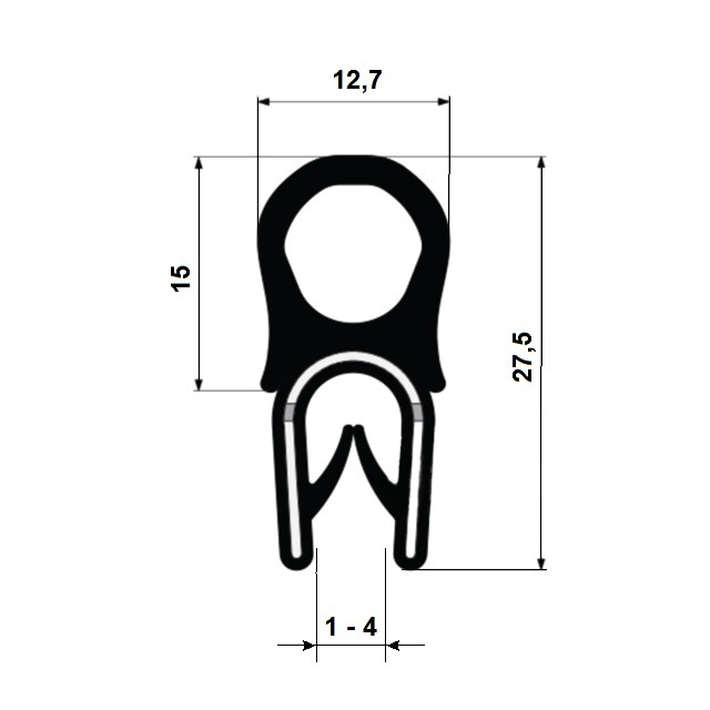 Těsnění PIRELI - pryžový profil U s horním těsněním s ocelovou výztuhou v materilálu PVC/EPDM.Použití: Těsnění dveří, oken, kabin, kapot nebo rozvodných skříní, vhodné pro těsnění automobilový, energetický a stavební průmysl.Těsnění díky integrované ocelové výztuži drží velmi dobře na hraně různých typů strojírenských výrobků.Vysoká odolnost: UV záření, ozónu, povětrnostním vlivům, kyselinám nízkých koncentrací, alkoholu, louhům.Mírná odolnost: Aromatické uhlovodíky, benzíny, oleje, koncentrované kyseliny.Rozměry dle ISO 3302-1 E2.
