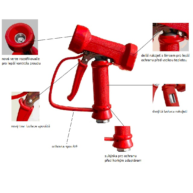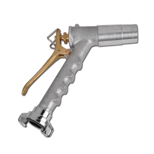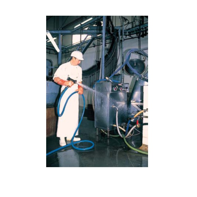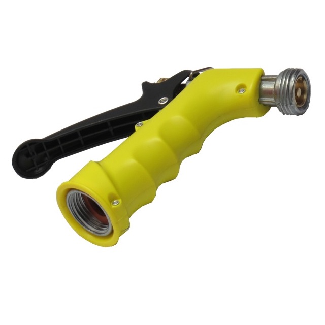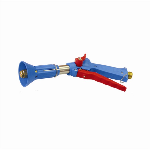 Použití v potravinářských provozech a nebo v zemědělství k mytí hrubých nečistot větším tlakem a teplou vodou. Oplachování strojů, boxů apod.Pistole je možno zaaretovat objímkou z drátu - páčka pro trvalé oplachování.Vhodná na horkou vodu, čistící prostředky, alkoholy, ketony, brzdové kapaliny, organické a anorganické kyseliny a zásady. Nejsou vhodné pro minerální oleje ani pro páru.Pistole jsou robustní, bezúdržbové, z mosazi nebo nerezu, mají EPDM povlak pro ochranu proti nárazu.Max. teplota +95ºC, regulovatelný průtok vody od širokého rozprašování po silný tenký proud.