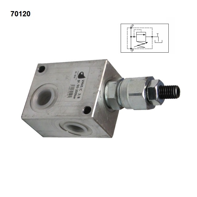 Pojišťovací tlakový ventil slouží k ochraně hydraulického systému před přetížením.Montáž: Vstup "P" je připojen k tlakové větvi. Druhý odvor je připojen do odpadní větvě, zpravidla k nádrži.Funkce: Pokud je tlak ve větvi ke stupu P větší než je tlak nastavený pružinou, ventil se otevře a přepustí se nabytečný tlakový olej do odpadní větve, čímž se sníží tlak v tlakové větvi.Nastavení: Povolte jistící matici a zašroubujte šroub pro přidání tlaku. Ke snížení pojistného tlaku se naopak šroub povoluje.