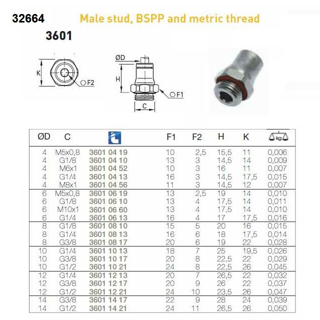 3601-0610; Provozní tlak (bar) 30, Rozměr vněj. závitu (mm) G1/8, Hmotnost (kg) 0,011, Šestihran 13, Určeno na hadici [mm] 6