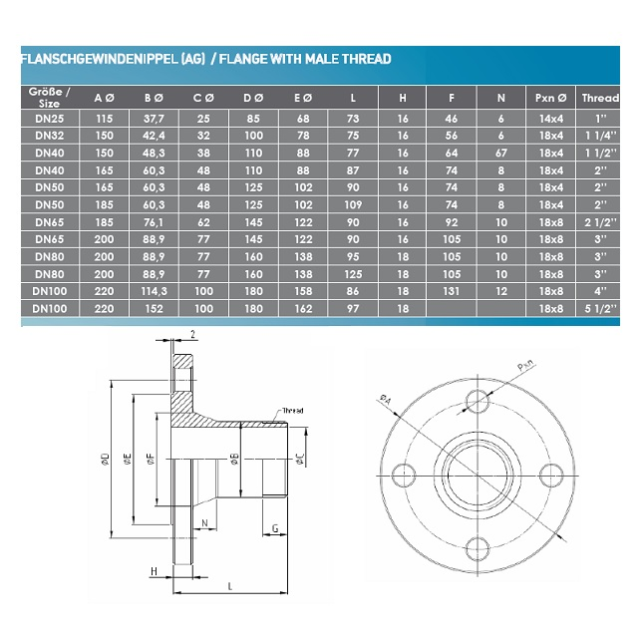 RFVG065AG52-L90/SS; Provozní tlak (bar) 16 Bar, Vnější závit G 2.1/2", DN (mm) 65, Délka nátrubku (mm) L=90, Hmotnost (kg) 3,91