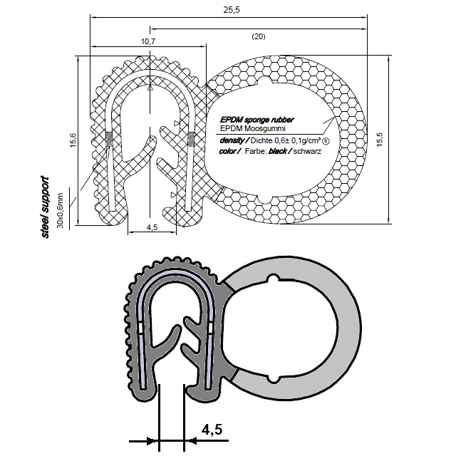 Profil s kovovou výztuží a horním těs. EPDM -40/+100°C, plech 0,5-1,5 mm